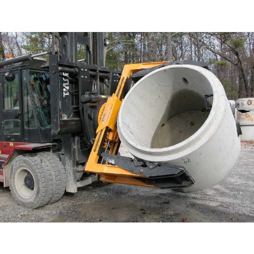 Ohne Verbindungsschläuche zum Stapler. Ermöglicht das Wenden von Betonprodukten, wie z. B. Schacht-Betonteile, um 180° (Drehbereich 360° endlos). Durch Wenden der Produkte um die Staplerlängsachse extrem geringes Vorbaumaß, daher Last- und Eigenschwerpunkt nahe beim Stapler.