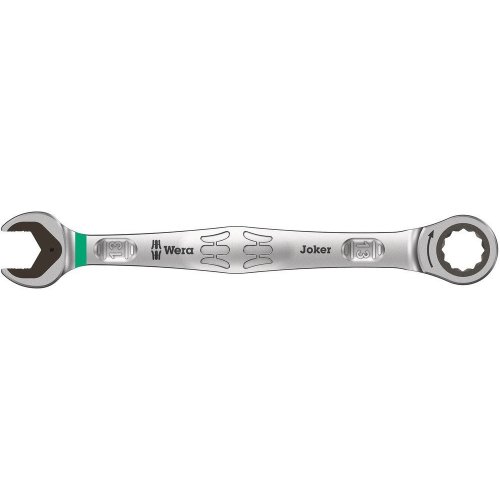 Hochwertiger Ringratschen-Maulschlüssel von Wera: Alles, was ein Schlüssel können muss. Und noch viel mehr. Schneller, besser, schöner. Eben ein echter Joker. Die neue Generation der Maul-Ringratschen-Schlüssel. Für Sechskant-Schraubenköpfe bzw. -Muttern. Mit Haltefunktion durch Metallplatte im Maul, die die Gefahr des Verlierens von Schrauben und Muttern reduziert. Die auswechselbare Metallplatte im Maul sichert mit extra harten Zähnen Schrauben und Muttern und reduziert die Abrutschgefahr. Der integrierte Endanschlag kann das Abrutschen vom Schraubenkopf nach unten verhindern und ermöglicht das Aufbringen hoher Drehmomente. Die Doppelsechskantgeometrie sorgt für die formschlüssige Verbindung mit Schraube oder Mutter und damit für die Verringerung der Abrutschgefahr. Ein Rückschwenkwinkel von nur 30° auf der Maulseite vermeidet zeitintensives Wenden des Schlüssels beim Schrauben. Ratschenmechanik auf der Ringseite mit außergewöhnlich hoher Feinverzahnung von 80 Zähnen für Flexibilität auch in engen Bauräumen. Die spezielle Schmiedegeometrie sorgt für hohe Drehmomentübertragung und hohe Biegungssteifigkeit. Gefertigt aus leistungsfähigem Chrom-Molybdän-Stahl mit Nickel-Chrom Beschichtung für hohen Korrosionsschutz. Mit Werkzeugfinder "Take it easy": Farbkennzeichnung nach Größen.