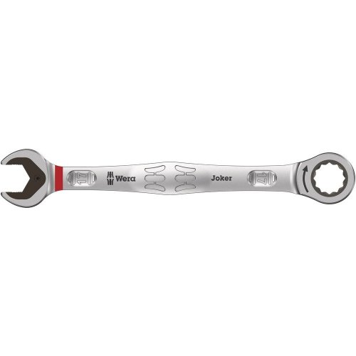 Hochwertiger Ringratschen-Maulschlüssel von Wera: Alles, was ein Schlüssel können muss. Und noch viel mehr. Schneller, besser, schöner. Eben ein echter Joker. Die neue Generation der Maul-Ringratschen-Schlüssel. Für Sechskant-Schraubenköpfe bzw. -Muttern. Mit Haltefunktion durch Metallplatte im Maul, die die Gefahr des Verlierens von Schrauben und Muttern reduziert. Die auswechselbare Metallplatte im Maul sichert mit extra harten Zähnen Schrauben und Muttern und reduziert die Abrutschgefahr. Der integrierte Endanschlag kann das Abrutschen vom Schraubenkopf nach unten verhindern und ermöglicht das Aufbringen hoher Drehmomente. Die Doppelsechskantgeometrie sorgt für die formschlüssige Verbindung mit Schraube oder Mutter und damit für die Verringerung der Abrutschgefahr. Ein Rückschwenkwinkel von nur 30° auf der Maulseite vermeidet zeitintensives Wenden des Schlüssels beim Schrauben. Ratschenmechanik auf der Ringseite mit außergewöhnlich hoher Feinverzahnung von 80 Zähnen für Flexibilität auch in engen Bauräumen. Die spezielle Schmiedegeometrie sorgt für hohe Drehmomentübertragung und hohe Biegungssteifigkeit. Gefertigt aus leistungsfähigem Chrom-Molybdän-Stahl mit Nickel-Chrom Beschichtung für hohen Korrosionsschutz. Mit Werkzeugfinder "Take it easy": Farbkennzeichnung nach Größen.